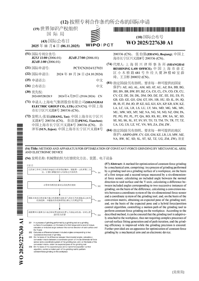 证券之星消息,根据企查查数据显示上海电气(601727)公布了一项国际专利申请,专利名为“机械臂的恒力打磨优化方法、装置、电子设备”,专利申请号为PCT/CN2024/127021,国际公布日为2025年11月6日。
