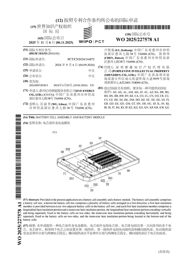 证券之星消息,根据企查查数据显示亿纬锂能(300014)公布了一项国际专利申请,专利名为“电芯组件及电池模块”,专利申请号为PCT/CN2024/116872,国际公布日为2025年11月6日。