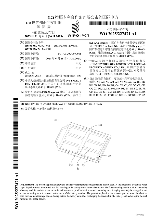 证券之星消息,根据企查查数据显示亿纬锂能(300014)公布了一项国际专利申请,专利名为“电池除水结构及电池包”,专利申请号为PCT/CN2024/099984,国际公布日为2025年11月6日。