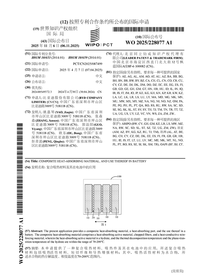 证券之星消息,根据企查查数据显示比亚迪(002594)公布了一项国际专利申请,专利名为“复合吸热材料及其在电池中的应用”,专利申请号为PCT/CN2025/087499,国际公布日为2025年11月6日。