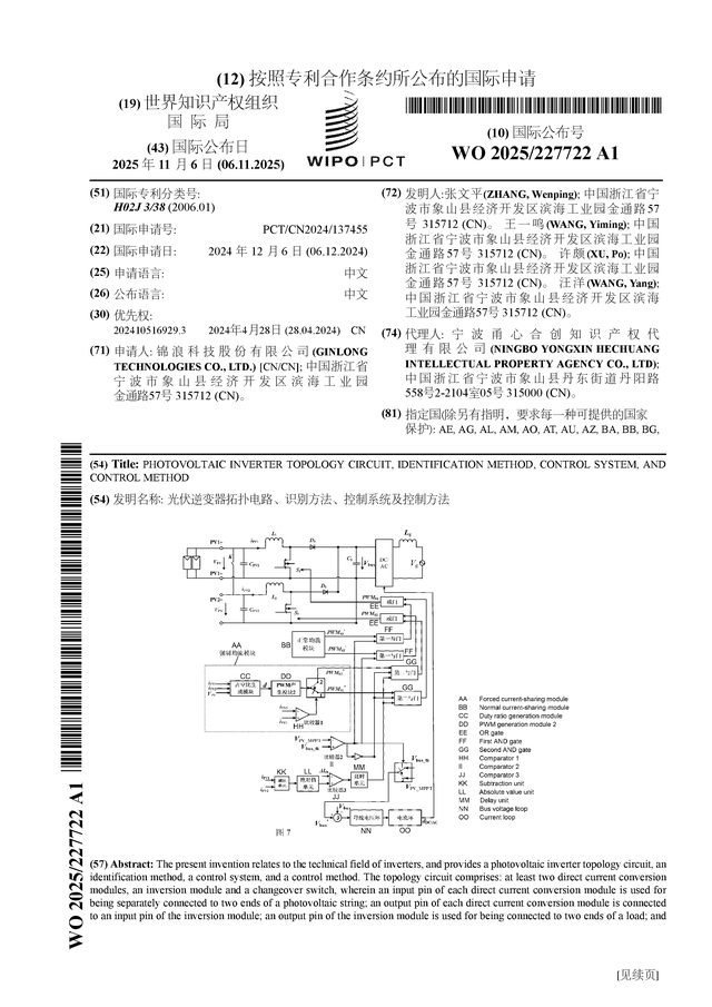 证券之星消息,根据企查查数据显示锦浪科技(300763)公布了一项国际专利申请,专利名为“光伏逆变器拓扑电路、识别方法、控制系统及控制方法”,专利申请号为PCT/CN2024/137455,国际公布日为2025年11月6日。