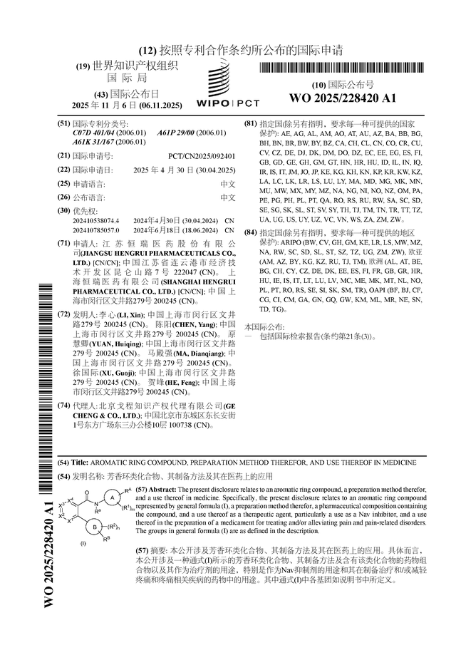 证券之星消息,根据企查查数据显示恒瑞医药(600276)公布了一项国际专利申请,专利名为“芳香环类化合物、其制备方法及其在医药上的应用”,专利申请号为PCT/CN2025/092401,国际公布日为2025年11月6日。