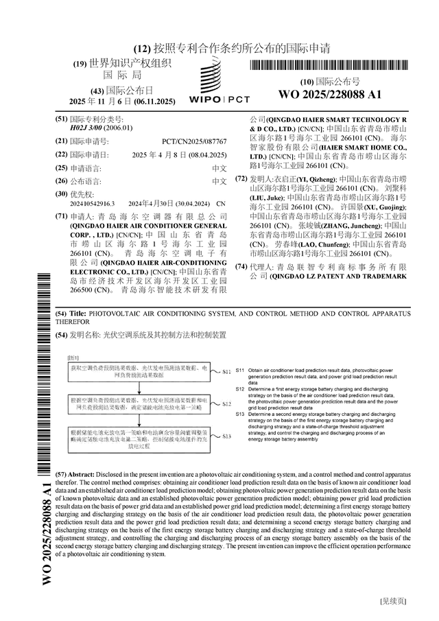 证券之星消息,根据企查查数据显示XD海尔智(600690)公布了一项国际专利申请,专利名为“光伏空调系统及其控制方法和控制装置”,专利申请号为PCT/CN2025/087767,国际公布日为2025年11月6日。