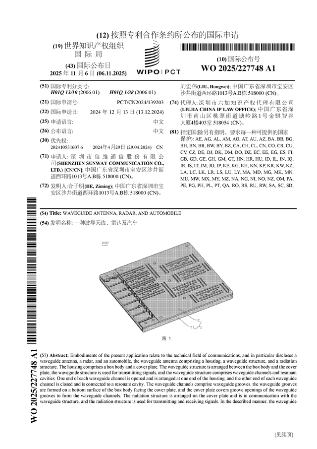 证券之星消息,根据企查查数据显示信维通信(300136)公布了一项国际专利申请,专利名为“一种波导天线、雷达及汽车”,专利申请号为PCT/CN2024/139203,国际公布日为2025年11月6日。