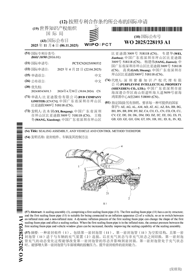 证券之星消息,根据企查查数据显示比亚迪(002594)公布了一项国际专利申请,专利名为“密封组件、车辆及其控制方法”,专利申请号为PCT/CN2025/090532,国际公布日为2025年11月6日。