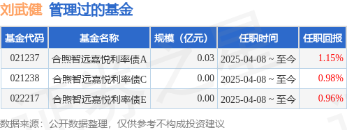 刘武健先生:中国国籍,北京大学数学学院学士、光华管理学院工商管理硕士,历任正元投资有限公司投资部副总裁,北京极至投资管理有限公司量化研究员;2021年11月加入合煦智远基金管理有限公司,曾任专户投资部副总监。2025年4月8日担任合煦智远嘉悦利率债债券型证券投资基金基金经理。