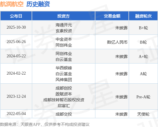 证券之星消息,根据天眼查APP于10月30日公布的信息整理,广州航润航空技术有限公司B+轮融资,融资额未披露,参与投资的机构包括海通开元,玄素投资。