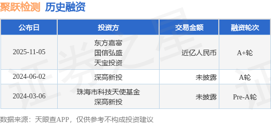 证券之星消息,根据天眼查APP于11月5日公布的信息整理,上海聚跃检测技术有限公司A+轮融资,融资额近亿人民币,参与投资的机构包括东方嘉富,国信弘盛,天宝投资。