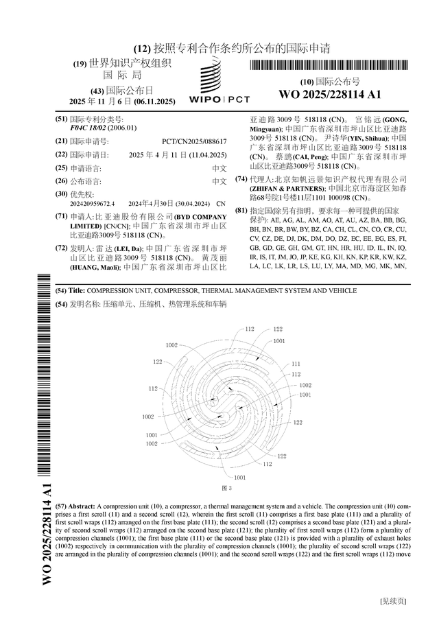 证券之星消息,根据企查查数据显示比亚迪(002594)公布了一项国际专利申请,专利名为“压缩单元、压缩机、热管理系统和车辆”,专利申请号为PCT/CN2025/088617,国际公布日为2025年11月6日。