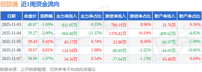 资金流向数据方面,本周创益通主力资金合计净流出1574.47万元,游资资金合计净流入2019.88万元,散户资金合计净流出445.41万元。本周资金流向一览见下表: