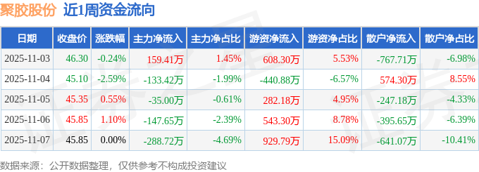 资金流向数据方面,本周聚胶股份主力资金合计净流出445.39万元,游资资金合计净流入1922.7万元,散户资金合计净流出1477.31万元。本周资金流向一览见下表: