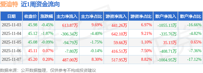 资金流向数据方面,本周爱迪特主力资金合计净流入691.94万元,游资资金合计净流入2077.48万元,散户资金合计净流出2769.42万元。本周资金流向一览见下表: