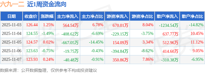 资金流向数据方面,本周六九一二主力资金合计净流出571.37万元,游资资金合计净流入550.96万元,散户资金合计净流入20.41万元。本周资金流向一览见下表: