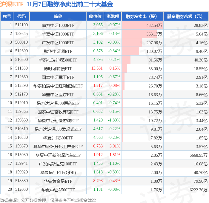 沪深ETF融券净卖出前三分别为:南方中证1000ETF(512100)融券净卖出432.54万股、华夏中证1000ETF(159845)融券净卖出363.17万股、广发中证1000ETF(560010)融券净卖出207.96万股,前20具体见下表: