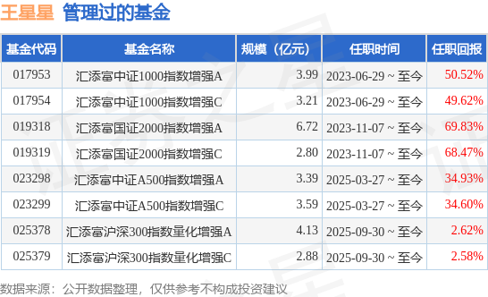 王星星先生:国籍中国,中国人民大学金融工程硕士。2015年8月至2023年2月任东方证券股份有限公司证券研究所研究员、高级研究员、高级分析师、业务总监(研究)。2023年2月加入汇添富基金管理股份有限公司,担任指数与量化投资部基金经理。2023年6月29日至今任汇添富中证1000指数增强型证券投资基金的基金经理。2023年11月7日至今任汇添富国证2000指数增强型证券投资基金的基金经理。2025年3月27日至今任汇添富中证A500指数增强型证券投资基金的基金经理。