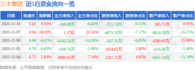 证券之星消息,三木集团11月10日涨停收盘,收盘价5.43元。该股于9点30分涨停,2次打开涨停,截止收盘封单资金为1.05亿元,占其流通市值4.14%。