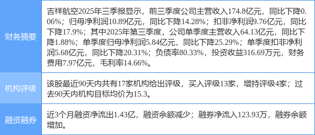 今日吉祥航空(603885)涨6.12%,收盘报14.04元。