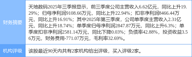 2025年9月2日,国元证券研究员耿军军,王朗发布了对天地数码的研报《2025年半年度报告点评:利润实现快速增长,海外业务高质量发展》,该研报对天地数码给出“买入”评级。研报中预测公司2025-2027年的营业收入为9.13、10.71、12.38亿元,归母净利润为1.22、1.58、1.98亿元,EPS为0.81、1.04、1.31元/股,对应的PE为24.26、18.79、15.00倍。考虑到行业的成长空间和公司业务的持续成长性,维持“买入”评级。证券之星数据中心根据近三年发布的研报数据计算,该研报作者对此股的盈利预测准确度为75.07%。