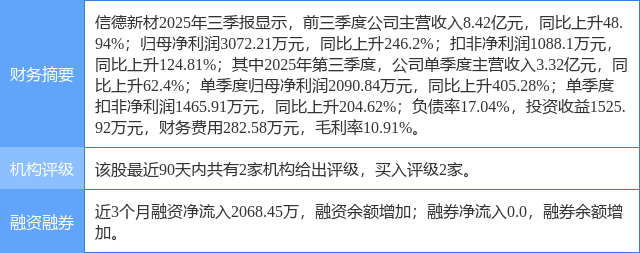 2025年10月28日,东吴证券研究员曾朵红,阮巧燕,岳斯瑶发布了对信德新材的研报《2025年三季报点评:快充需求旺盛满产满销单位盈利逐季修复》,该研报对信德新材给出“买入”评级。证券之星数据中心根据近三年发布的研报数据计算,该研报作者对此股的盈利预测准确度为28.66%。