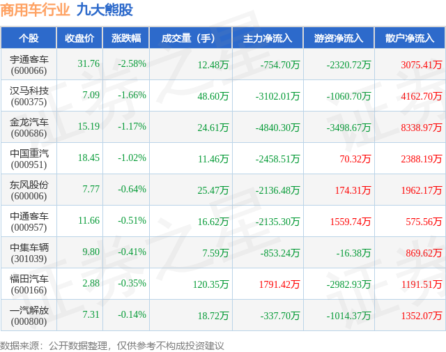 个股表现方面,商用车行业当日领跌股为宇通客车(600066),该股当日报收31.76,下跌2.58%,成交量12.48万,主力资金净流出754.7万元。汉马科技(600375)以下跌1.66%紧随其后,该股当日成交量48.6万,主力资金净流出3102.01万元。除此之外,金龙汽车(600686)、中国重汽(000951)、东风股份(600006)均进入当日熊股之列。具体个股列表见下表: