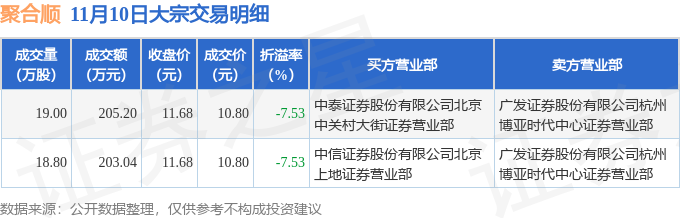 证券之星消息,11月10日聚合顺发生大宗交易,交易数据如下: