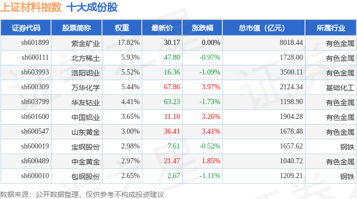 上证材料(000033)指数十大成份股详情如下: