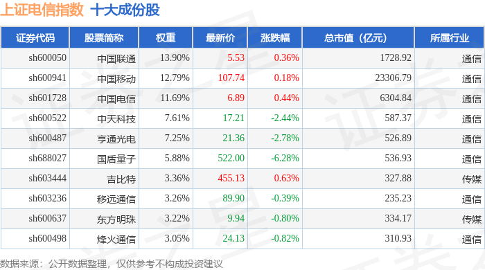 证券之星消息,11月10日,上证电信(000040)指数报收于3990.13点,跌0.49%,成交199.78亿元,换手率0.73%。当日该指数成份股中,上涨的有20家,中国电影以4.04%的涨幅领涨,下跌的有10家,国盾量子以6.28%的跌幅领跌。