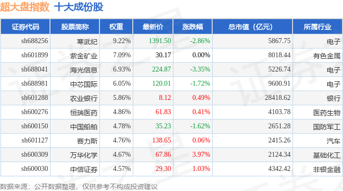 超大盘(000043)指数十大成份股详情如下: