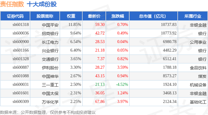 证券之星消息,11月10日,责任指数(000048)报收于1469.88点,涨0.65%,成交784.43亿元,换手率0.72%。当日该指数成份股中,上涨的有69家,中国中免以10.0%的涨幅领涨,下跌的有29家,三一重工以4.52%的跌幅领跌。