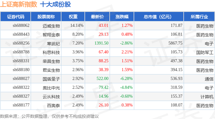 证券之星消息,11月10日,上证高新(000131)指数报收于3681.66点,涨0.13%,成交404.18亿元,换手率1.56%。当日该指数成份股中,上涨的有29家,英方软件以14.28%的涨幅领涨,下跌的有20家,国盾量子以6.28%的跌幅领跌。