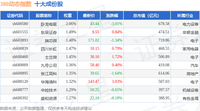 证券之星消息,11月10日,380动态(000141)指数报收于3874.3点,涨0.25%,成交1118.75亿元,换手率2.26%。当日该指数成份股中,上涨的有110家,索通发展以8.68%的涨幅领涨,下跌的有78家,新泉股份以10.0%的跌幅领跌。