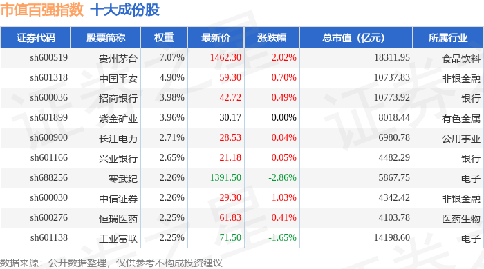 证券之星消息,11月10日,市值百强(000155)指数报收于3340.63点,涨0.39%,成交2462.36亿元,换手率0.43%。当日该指数成份股中,上涨的有70家,中国中免以10.0%的涨幅领涨,下跌的有27家,拓普集团以6.64%的跌幅领跌。