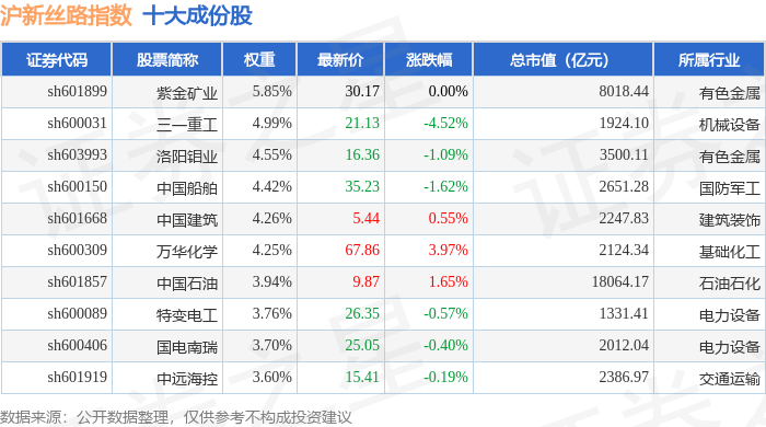 证券之星消息,11月10日,沪新丝路(000160)指数报收于2153.26点,跌0.07%,成交904.14亿元,换手率0.89%。当日该指数成份股中,上涨的有27家,东方电气以7.68%的涨幅领涨,下跌的有37家,三一重工以4.52%的跌幅领跌。