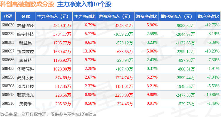 资金流向方面,科创高装(000687)指数成份股当日主力资金净流出合计6.74亿元,游资资金净流入合计6.27亿元,散户资金净流入合计4747.06万元。成份股资金流向详情见下表: