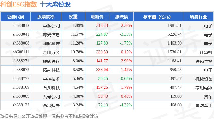 证券之星消息,11月10日,科创ESG(000691)指数报收于1490.74点,涨0.07%,成交446.04亿元,换手率1.39%。当日该指数成份股中,上涨的有28家,特宝生物以4.49%的涨幅领涨,下跌的有22家,西部超导以4.32%的跌幅领跌。