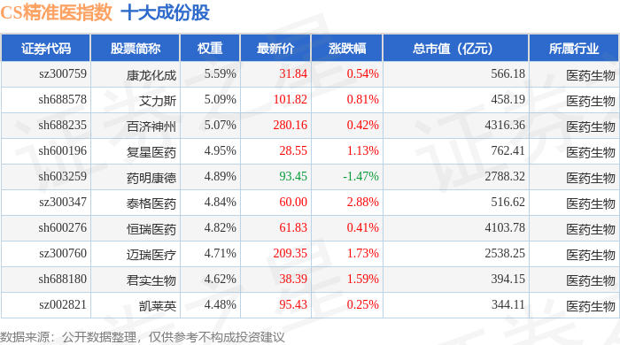 证券之星消息,11月10日,CS精准医(000863)指数报收于2825.04点,涨1.24%,成交175.54亿元,换手率1.29%。当日该指数成份股中,上涨的有32家,中源协和以8.86%的涨幅领涨,下跌的有6家,药明康德以1.47%的跌幅领跌。