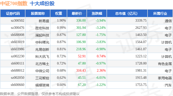 证券之星消息,11月10日,中证700(000907)指数报收于6463.82点,涨0.23%,成交7019.79亿元,换手率1.73%。当日该指数成份股中,上涨的有459家,北京君正以10.22%的涨幅领涨,下跌的有228家,新泉股份以10.0%的跌幅领跌。