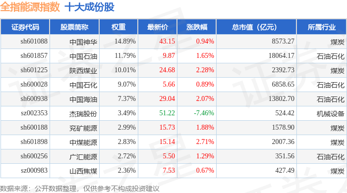 全指能源(000986)指数十大成份股详情如下:
