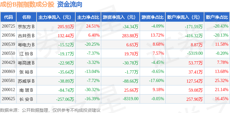 资金流向方面,成份B指(399003)指数成份股当日主力资金净流出合计135.63万元,游资资金净流入合计179.52万元,散户资金净流出合计43.89万元。成份股资金流向详情见下表: