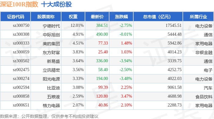 证券之星消息,11月10日,深证100R(399004)指数报收于8359.97点,涨0.08%,成交2422.53亿元,换手率1.37%。当日该指数成份股中,上涨的有75家,泸州老窖以8.23%的涨幅领涨,下跌的有24家,三花智控以6.01%的跌幅领跌。