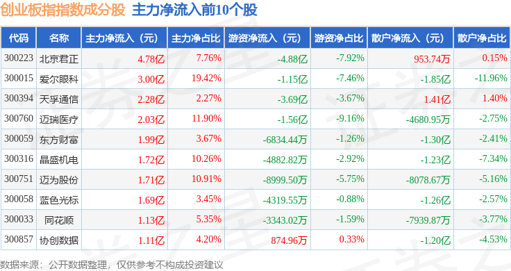 资金流向方面,创业板指(399006)指数成份股当日主力资金净流出合计74.12亿元,游资资金净流入合计18.41亿元,散户资金净流入合计55.71亿元。成份股资金流向详情见下表: