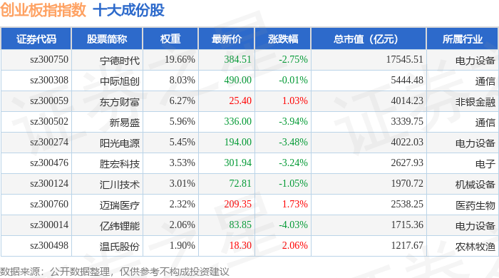 创业板指(399006)指数十大成份股详情如下: