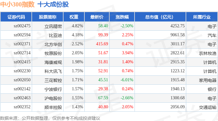 中小300(399008)指数十大成份股详情如下: