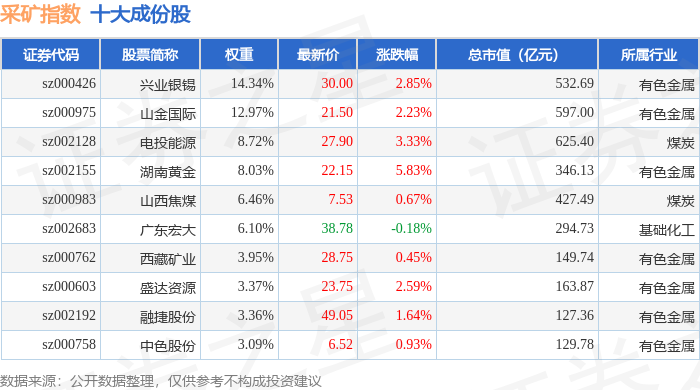 证券之星消息,11月10日,采矿指数(399232)报收于3770.62点,涨2.09%,成交167.37亿元,换手率2.84%。当日该指数成份股中,上涨的有18家,国城矿业以9.99%的涨幅领涨,下跌的有12家,新大洲A以2.67%的跌幅领跌。