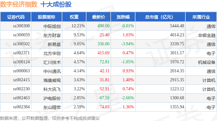 证券之星消息,11月10日,数字经济(399262)指数报收于2746.78点,跌0.04%,成交1268.26亿元,换手率2.08%。当日该指数成份股中,上涨的有28家,北京君正以10.22%的涨幅领涨,下跌的有21家,新易盛以3.94%的跌幅领跌。