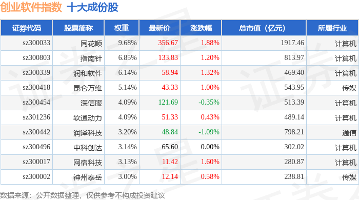 证券之星消息,11月10日,创业软件(399264)指数报收于1498.77点,涨0.83%,成交251.48亿元,换手率2.16%。当日该指数成份股中,上涨的有38家,彩讯股份以3.69%的涨幅领涨,下跌的有9家,航天智装以4.05%的跌幅领跌。