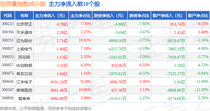 资金流向方面,创质量(399269)指数成份股当日主力资金净流出合计55.38亿元,游资资金净流入合计13.52亿元,散户资金净流入合计41.86亿元。成份股资金流向详情见下表: