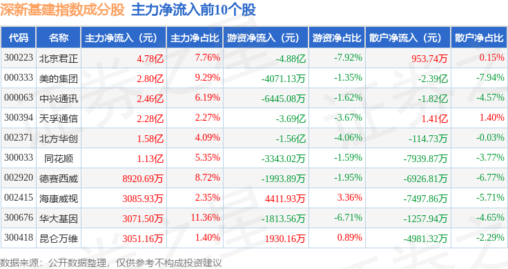 资金流向方面,深新基建(399274)指数成份股当日主力资金净流出合计44.15亿元,游资资金净流入合计10.91亿元,散户资金净流入合计33.24亿元。成份股资金流向详情见下表: