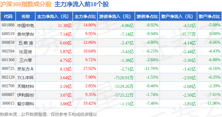 资金流向方面,沪深300(399300)指数成份股当日主力资金净流出合计131.51亿元,游资资金净流入合计11.48亿元,散户资金净流入合计120.03亿元。成份股资金流向详情见下表: