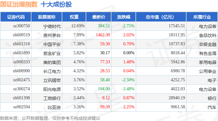 证券之星消息,11月10日,国证治理(399322)指数报收于10578.09点,涨0.35%,成交1652.33亿元,换手率0.48%。当日该指数成份股中,上涨的有38家,泸州老窖以8.23%的涨幅领涨,下跌的有11家,三花智控以6.01%的跌幅领跌。